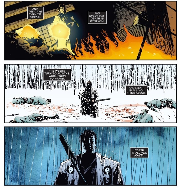 The Punisher is also adapted, which worked pretty well for the most part. What really stands out in this Punisher issue was the art for me. The dark shadows, brutal slaying of samurai, and the act of suicide is contrasted with bright, pleasant times for the Punisher’s family in the grain fields. Laurence Campbell does an amazing job at painting the environment and showing the tension in each panel. Still, the Punisher’s story is a bit disconnected in the end.
